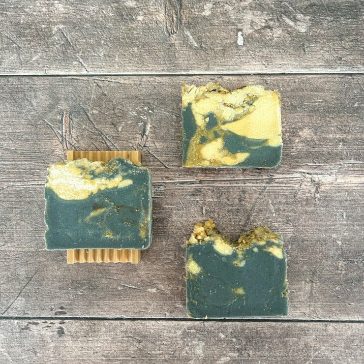 Ingredients: 100% Saponified water, aloe vera juice, certified organic shea butter, wheatgerm oil, Australian hemp seed oil, castor oil, certified organic mango butter, Australian olive oil, kaolin clay, activated charcoal, turmeric, pure essential oils of cinnamon leaf and sweet orange, fragrance oil of cucumber