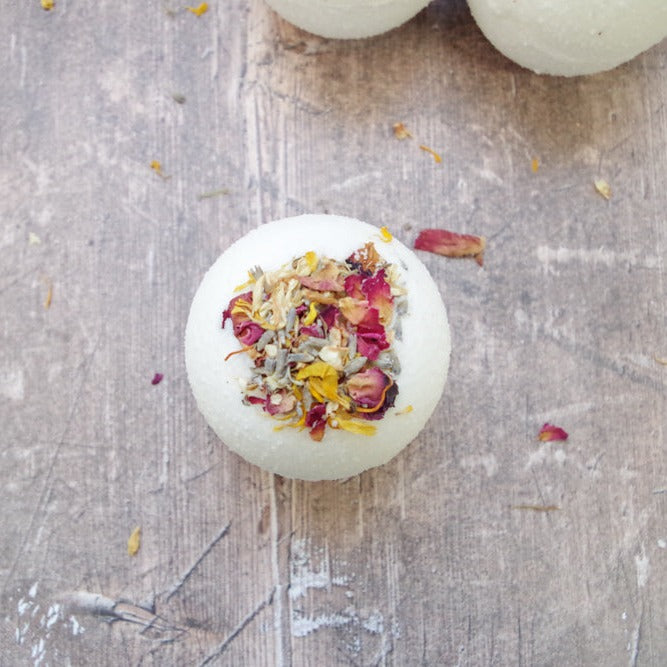Ingredients: Sodium bicarbonate, citric acid, epsom salts, locally grown (and pressed) olive oil, cocoa butter, polysorbate 20 (emulsifier), fragrance blend, mixed dried botanicals (including rose petals, calendula flowers, jasmine, & lavender flowers), custom mica colour blend