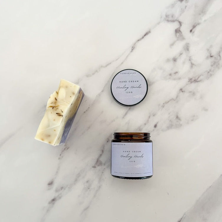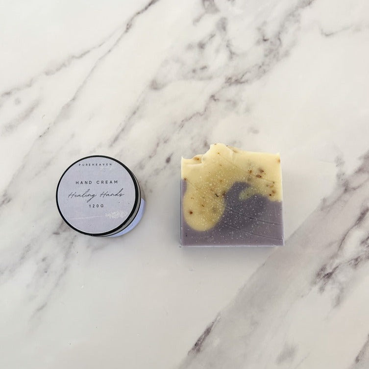 A 120g jar of Healing Hands paired with 1 of your favourite soaps (or 1 of our faves if you don’t have a preference) 😉. Perfect for gifting or as little ‘treat yourself’ surprise! If you would like a specific fragrance selection (for soap only), please let us know in the ‘notes’ section at the checkout, otherwise we will pick something we think you’ll love (based on what everyone else loves, i.e. our best sellers)!
