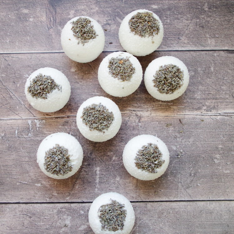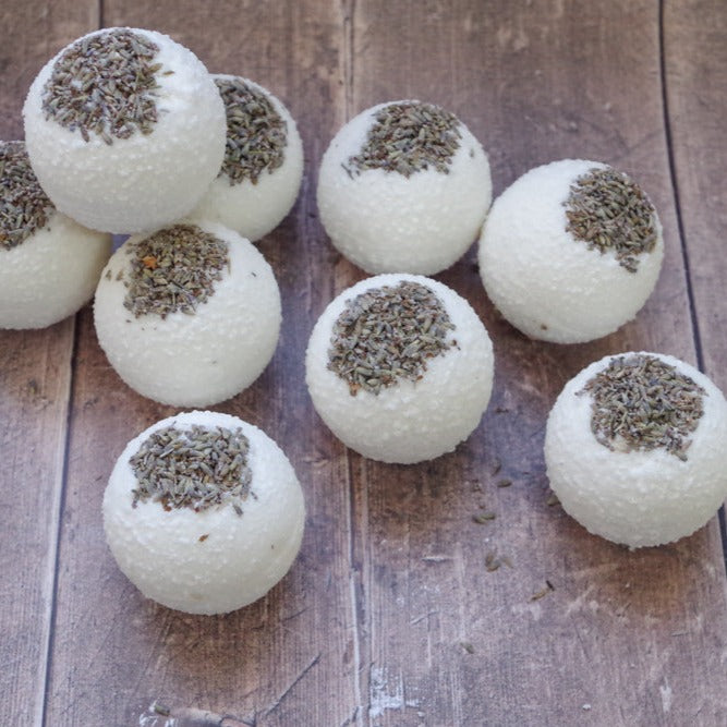 Ingredients: Sodium bicarbonate, citric acid, epsom salts, locally grown (and pressed) olive oil, cocoa butter, polysorbate 20 (emulsifier), fragrance blend, mixed dried botanicals (lavender flowers).